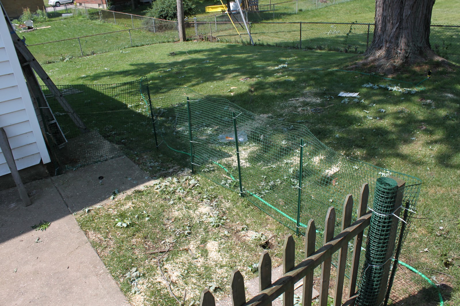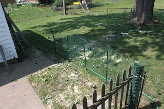 Daddy put up this temporary fence so Rylyn and Lucy could go out back and be safe! Lucy still isn\’t sure about all this \”stuff\” in HER yard.