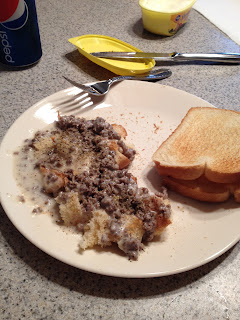 We went to Nana and Papa G\’s house for dinner on Tuesday. Daddy had Ham and Soup Beans and Mommy had hamburger gravy over toast (see picture above), it was very very good!