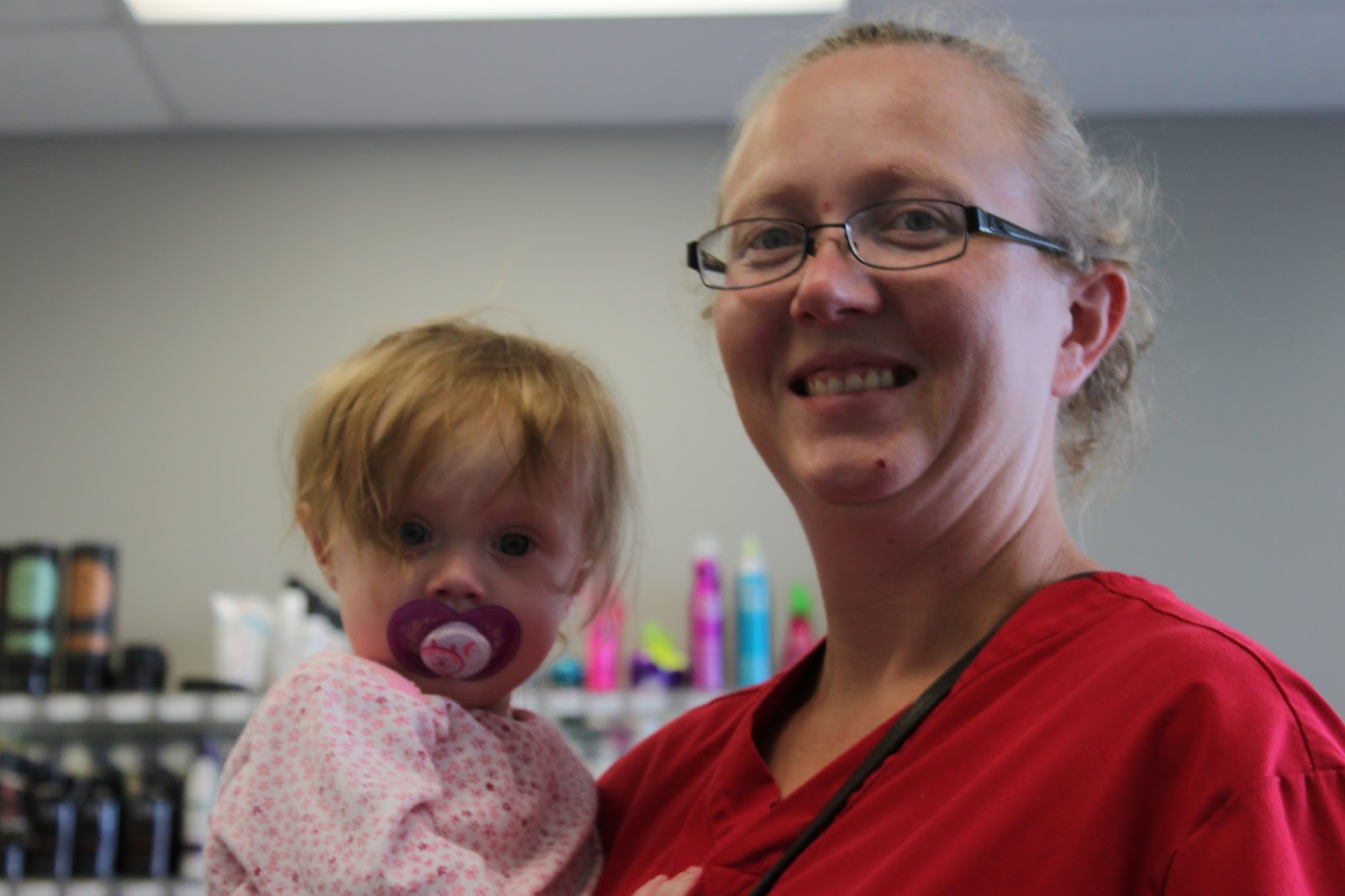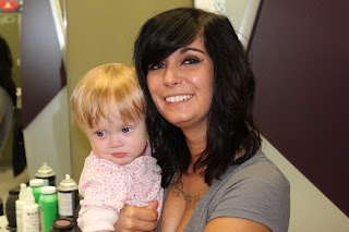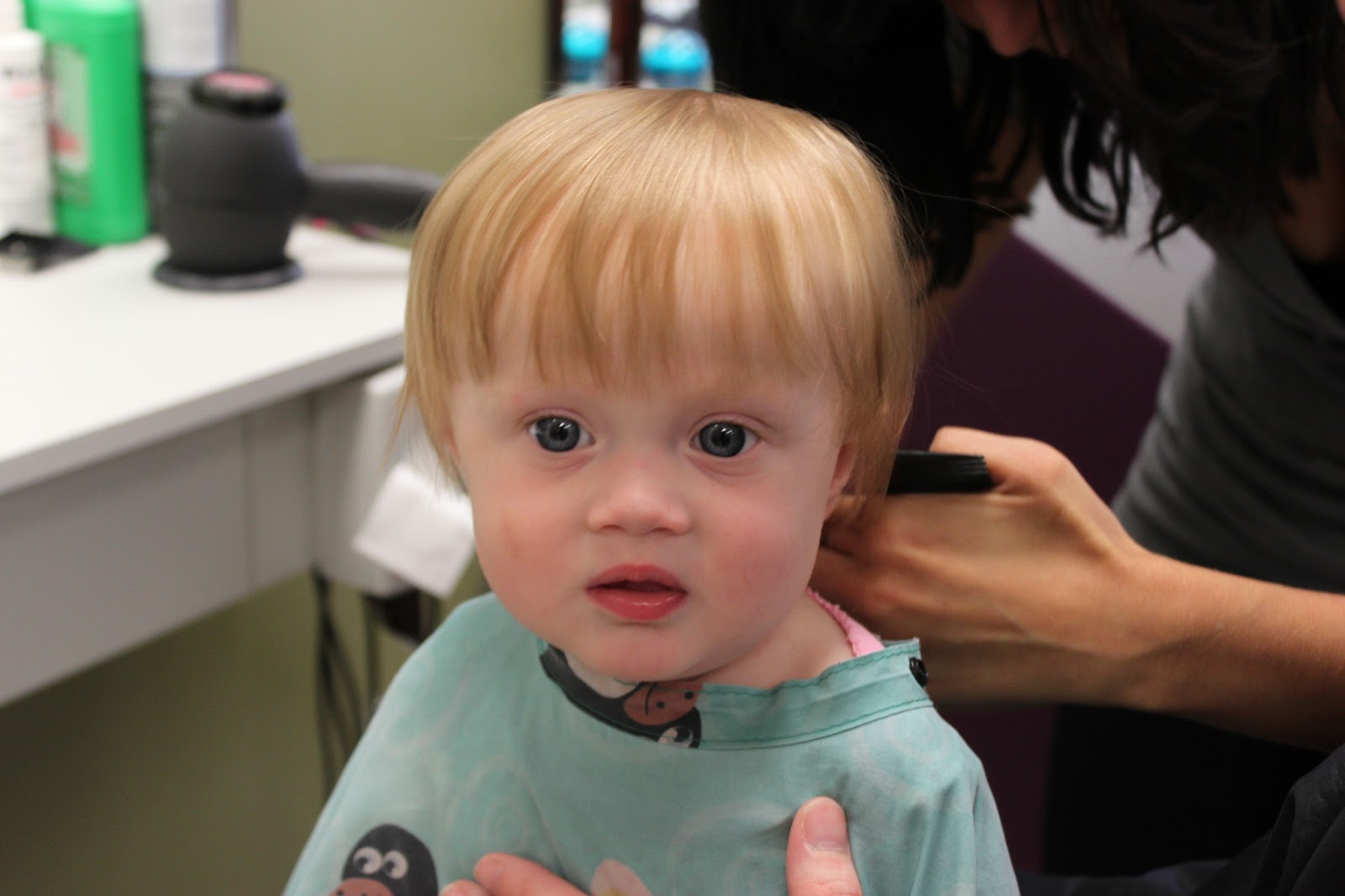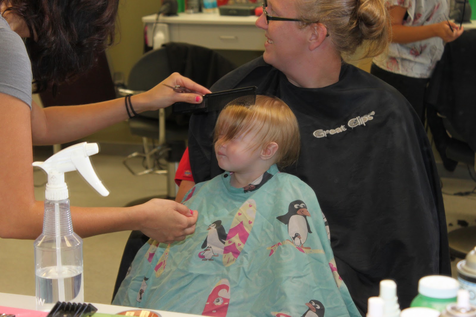 On Tuesday Mommy and Daddy took me to get my first hair cut. That was pretty exciting, I got to sit on Mommy\’s lap while Chelsea cut my hair, I got to wear a cute penguin \”cape\” and everything.